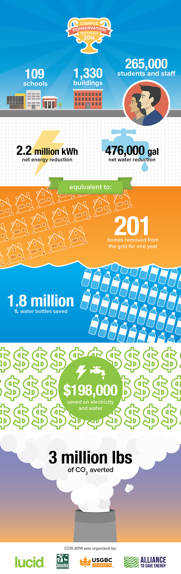 What if energy mangers were not alone in their efforts? What if everyone on campus participated in the challenge? This is exactly what happens during Campus Conservation Nationals (CCN), the largest energy and water reduction competition for colleges and universities in the world, which just finished its fourth year on April 25. A partnership between Lucid, the Center for Green Schools at USGBC, the National Wildlife Federation, and the Alliance to Save Energy, CCN 2014 had 109 schools, 1330 buildings, and 265,000 students and staff participate.