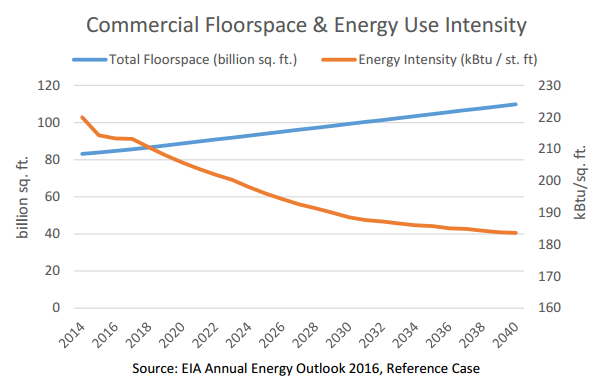 How is commercial floor space becoming more efficient? Three main reasons: building energy codes, appliance and equipment standards, and utility-sponsored energy efficiency programs.