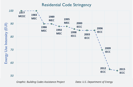 Established by state and local governments, building energy codes set minimum efficiency levels for new and renovated buildings and are a practical, cost-effective way to drive down energy consumption. Periodic updates to these codes ensure that building energy efficiency increases steadily over time consistent with building and equipment trends, leading to a steady decrease in building energy consumption and lower utility bills. One widely adopted model code is the International Code Council’s International Energy Conservation Code (IECC), which is updated on a three-year cycle following extensive stakeholder negotiations and consultation with the Department of Energy (DOE). Recent versions of the IECC have helped decrease the energy use intensity of U.S. homes by over 40% since the 1970s, directly translating into lower monthly utility bills. In June 2016, the U.S. Conference of Mayors unanimously adopted a resolution calling for stronger model codes.